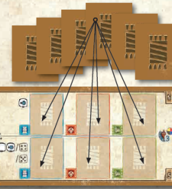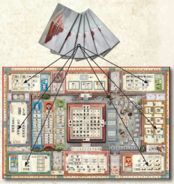| 2. Перемешайте планшеты действий, пронумерованные от 2 до 7, и выложите их лицевой стороной вверх в случайном порядке поверх планшетов 2, 3, 4, 5, 6 и 7, напечатанных на игровом поле. Напечатанные планшеты 1 и 8 никогда не закрываются другими планшетами действий. |  |
