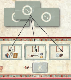 | 4. Возьмите случайным образом 6 жетонов технологий и разложите их по номерам, указанным в их правом верхнем углу. Положите эти жетоны лицевой стороной вверх на планшет жрецов (5) в возрастающем порядке, слева направо, начиная с верхнего ряда. |  |